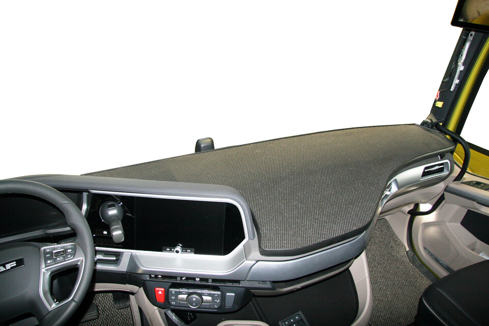 Großer, dunkelgrauer Tisch mit feiner Struktur, passend für das Armaturenbrett eines DAF LKW ab 2022.