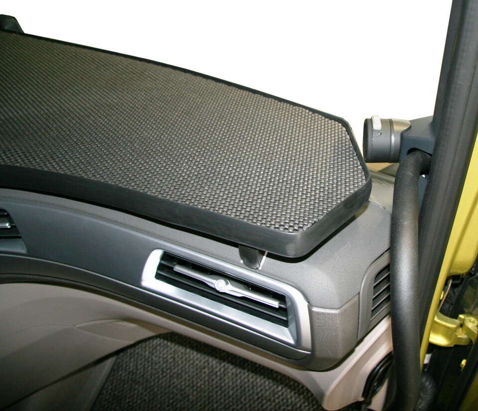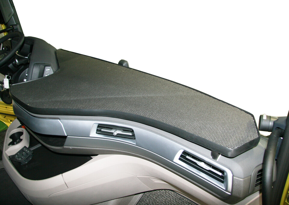 Großer, schwarzer Tisch mit strukturierter Oberfläche auf dem Armaturenbrett eines LKW.