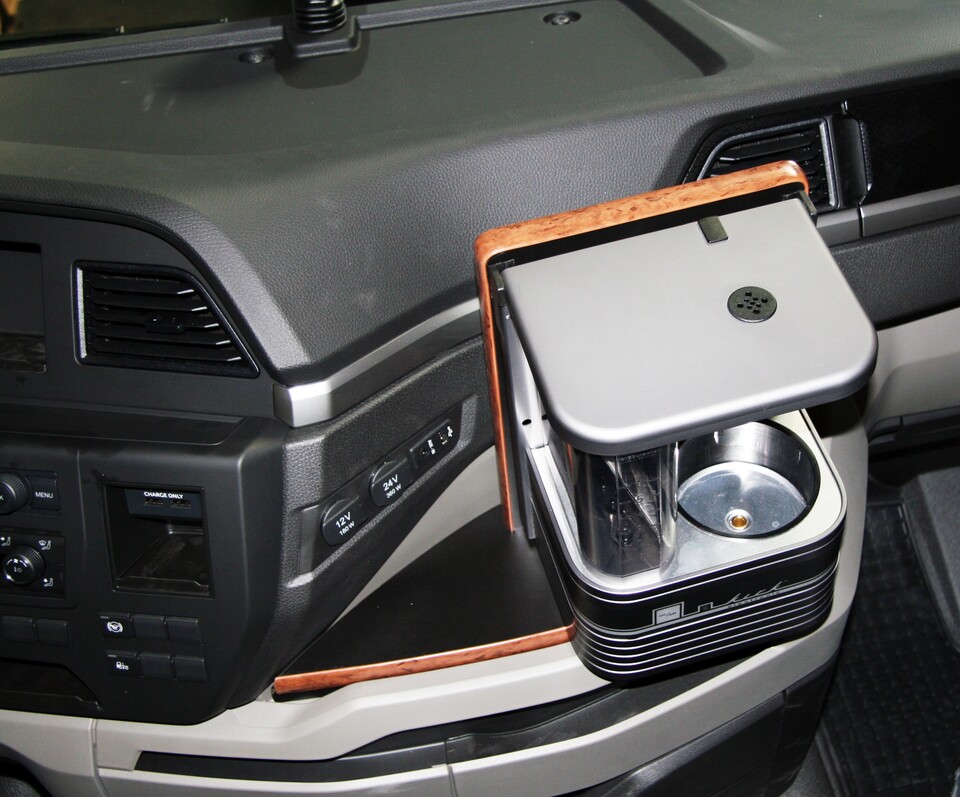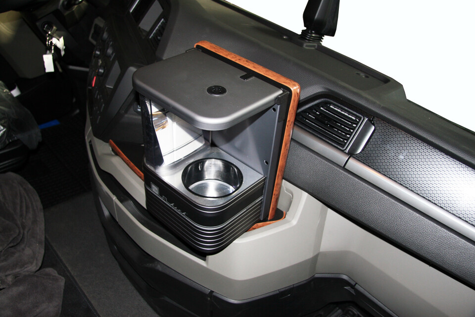 Kaffeetisch mit dunkler Oberfläche und Holzdekor-Rand, in MAN TGX LKW-Cockpit eingebaut.