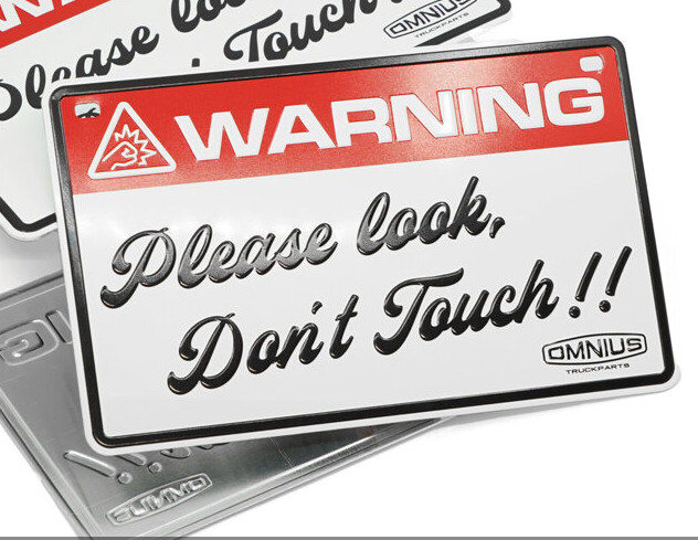 Weiß-rotes Schild mit schwarzem Rand und der Aufschrift 'WARNING Please look, Don't Touch !!' und einem Faust-Warnsymbol.