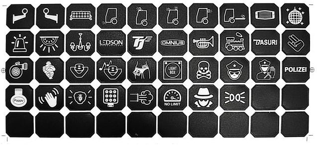 Schwarzes Symbolblatt mit vielen weißen Icons für Commander-Bedienfelder, darunter LKW-Zubehör-Symbole.