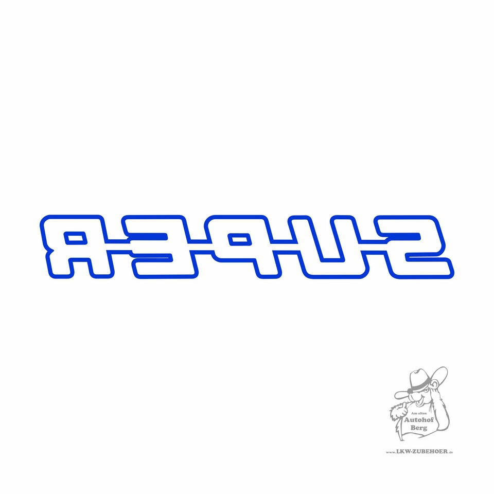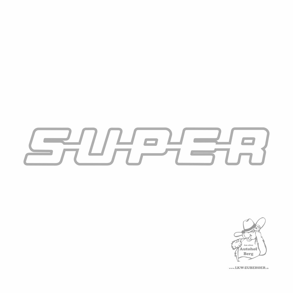 Grauer Kontur-Aufkleber mit dem Schriftzug SUPER auf weißem Hintergrund.