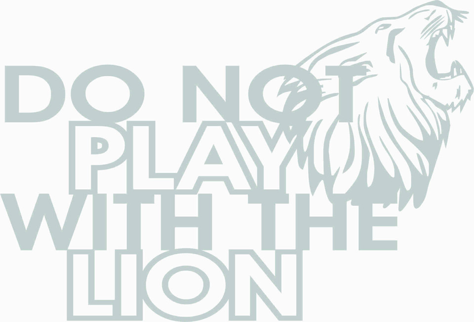 Grauer Aufkleber mit dem Text "DO NOT PLAY WITH THE LION" und einem brüllenden Löwenkopf.