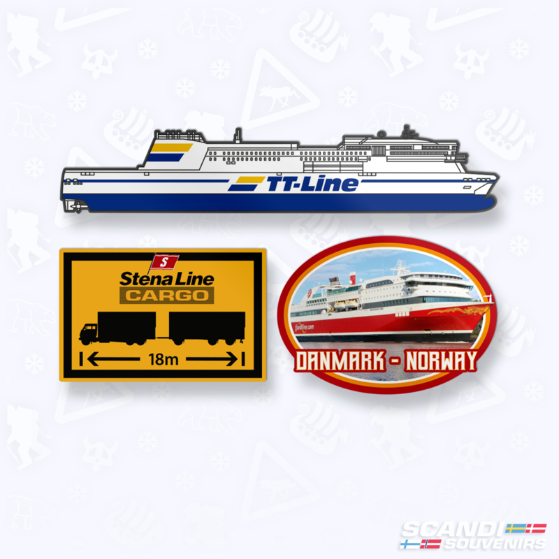 Buntes Scandi Stickerset mit Fährmotiven: TT-Line Fähre, gelbes Stena Line Cargo Schild, ovaler Norwegen Fähren-Aufkleber.