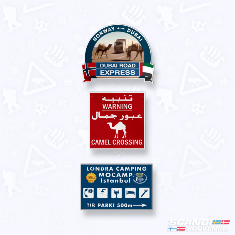 Set aus drei farbigen Aufklebern: Norway-Dubai mit LKW und Kamelen, roter Camel Crossing Aufkleber, blauer Londra Camping Aufkleber.