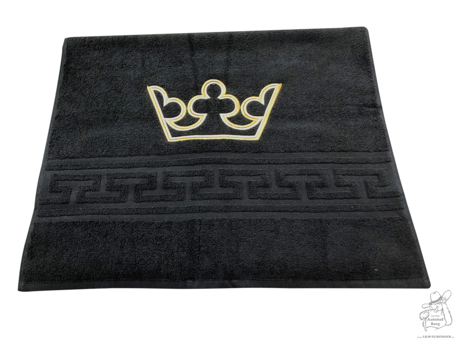 Schwarzes Duschtuch mit goldener Kronen-Stickerei und eingewebtem Muster.