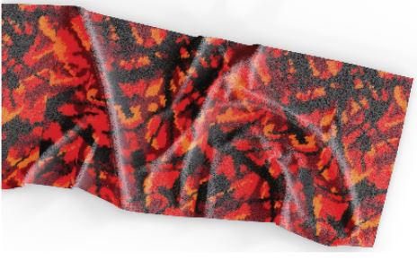 Plüsch-Strandtuch aus Mikrofaser mit lebhaftem Muster in Rot, Orange und Schwarz.
