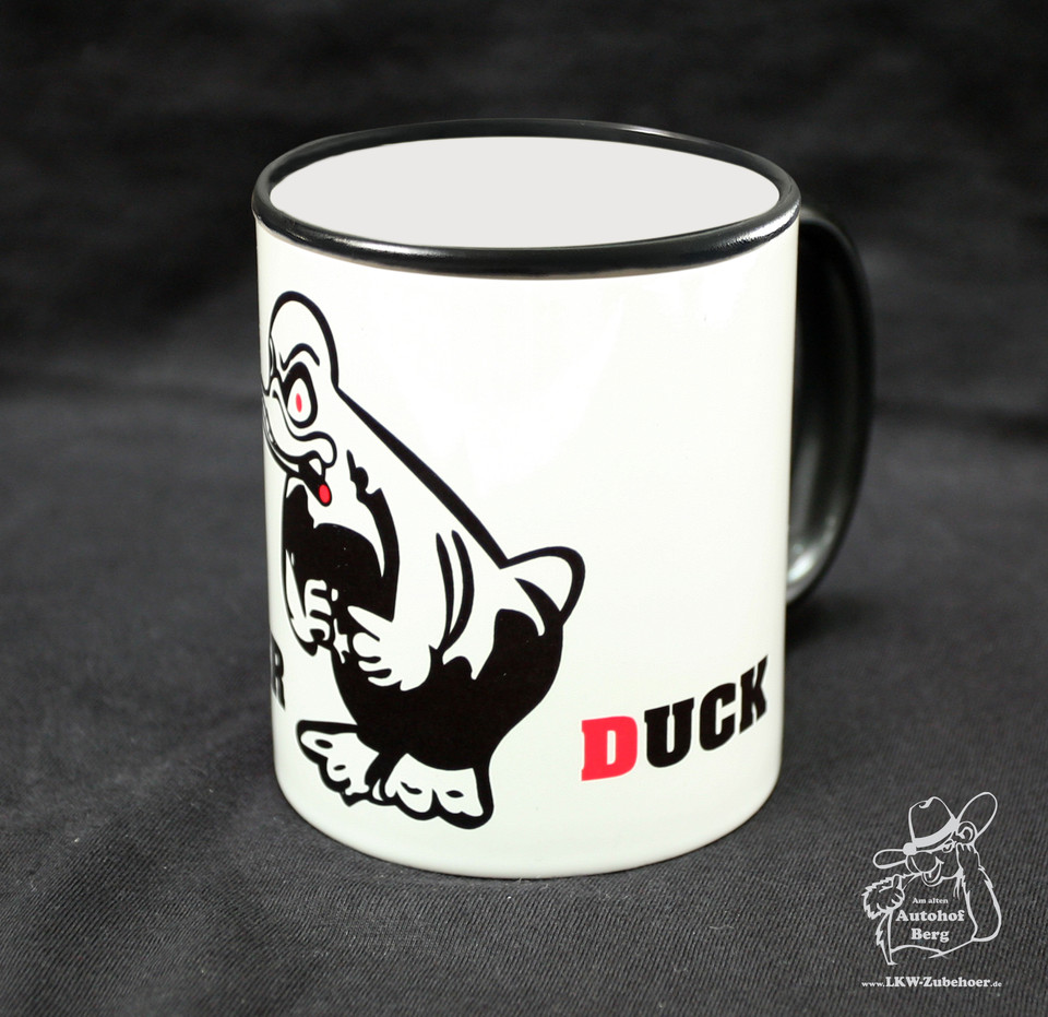 Weiße Tasse mit schwarzem Rand und Henkel, bedruckt mit einer Cartoon-Ente und dem Schriftzug 'DUCK'.