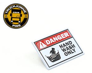 TJ Pin Hand wash only: Weißer, rechteckiger Emaille-Pin mit rotem 'DANGER', 'HAND WASH ONLY' und Hand-Symbol.