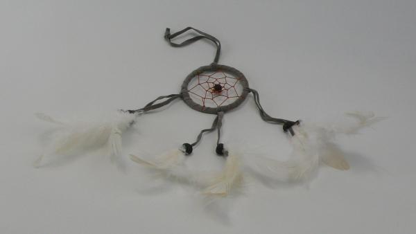 Runder Traumfänger mit grauem Ring, rotem Netz, dunklen Perlen und mehreren weißen Federn.