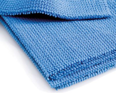 Blaues, gefaltetes Pflegetuch aus Mikrofaser mit randloser Kante.