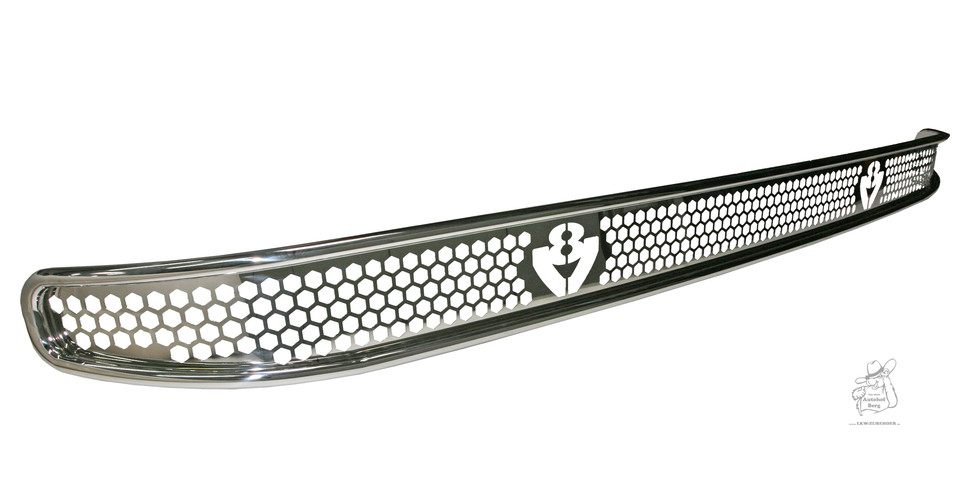 Scheibengitter New Generation mit runden Kanten, glänzendem Metall und Wabenmuster, verziert mit V8-Logos.