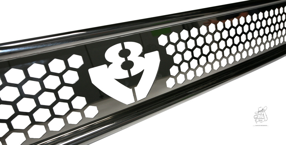 Glänzendes, chromfarbenes Scheibengitter mit Wabenmuster und Scania V8 Logo.