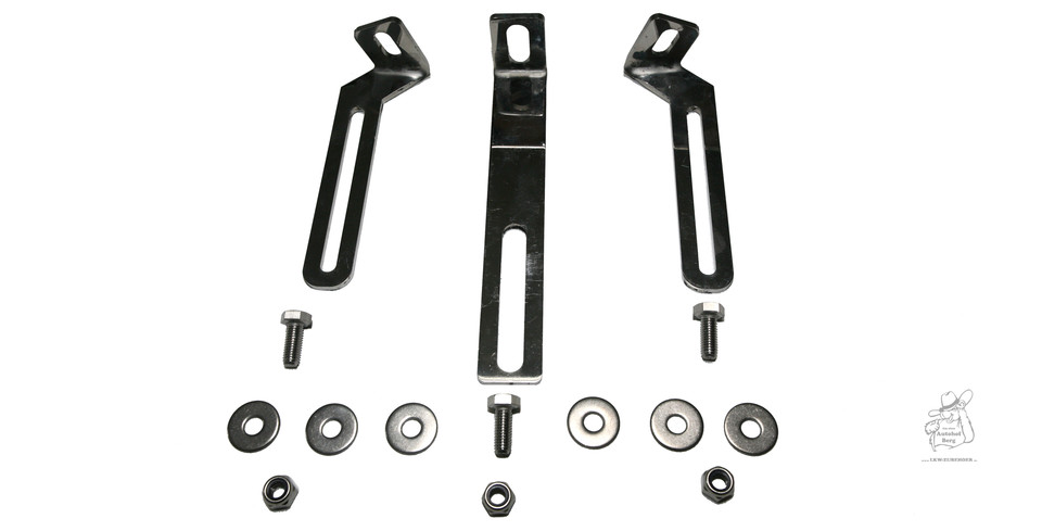 Scheibengitter Montageset: Drei glänzende Metallhalterungen mit Schrauben, Muttern und Unterlegscheiben.
