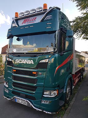 Front eines dunkelgrauen Scania LKWs mit schwarzem, perforiertem Scheibengitter "Rounded Edges" über der Windschutzscheibe.