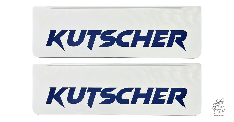 Ein Paar weiße Schmutzfänger mit Wulst und dunkelblauer "KUTSCHER" Beschriftung.