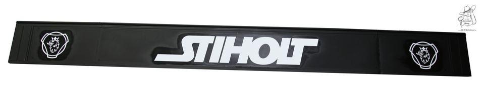 Schwarzer Gummi-Schmutzfänger mit erhabenem, weißem STIHOLT Schriftzug und Scania Logos an den Enden.