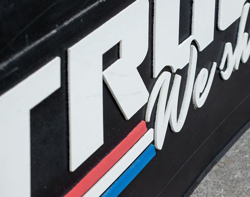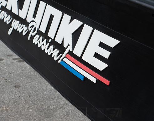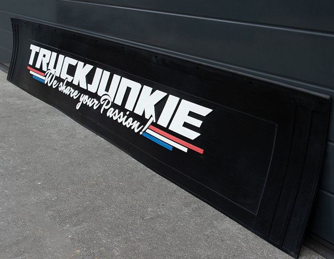 Schwarze Gummi-Heckschürze mit weißem 3D-TRUCKJUNKIE Schriftzug, farbigen Streifen und Montagekante.