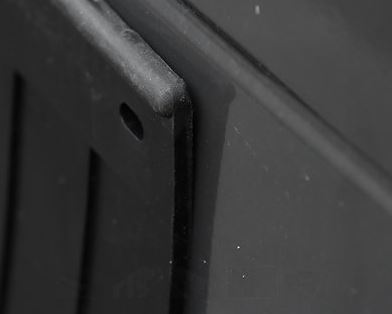 Detailansicht einer schwarzen TJ Heckschürze aus Gummi mit Montagekante und Befestigungsloch.