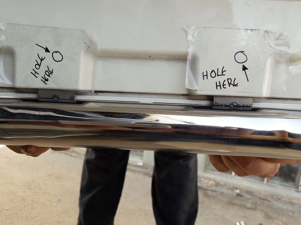 Glänzendes Türrohr für LKW, gehalten vor einem weißen Fahrzeugteil mit markierten Bohrpunkten zur Montage.
