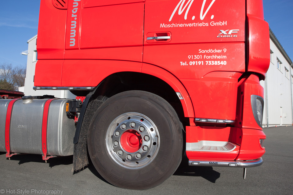 Glänzende Rohre mit integrierten LEDs an der Seite eines roten DAF LKW.