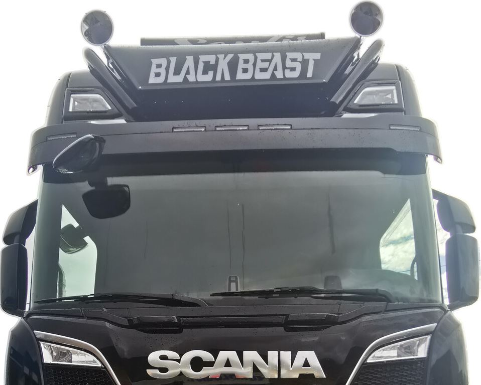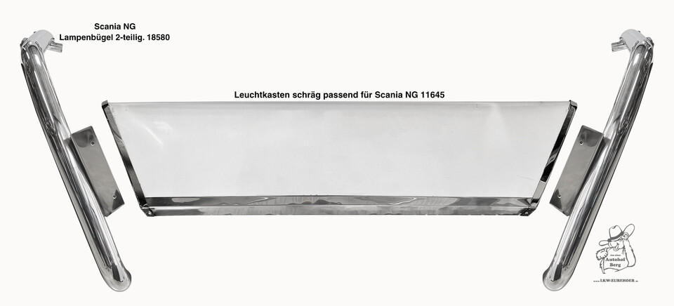 Schräger Leuchtkasten mit 2-teiligen, glänzenden Lampenbügeln für Scania NG auf weißem Hintergrund.