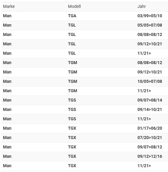 Kompatibilitätstabelle für Antennenhalterung: MAN LKW Modelle TGA, TGL, TGM, TGS, TGX mit Baujahren.