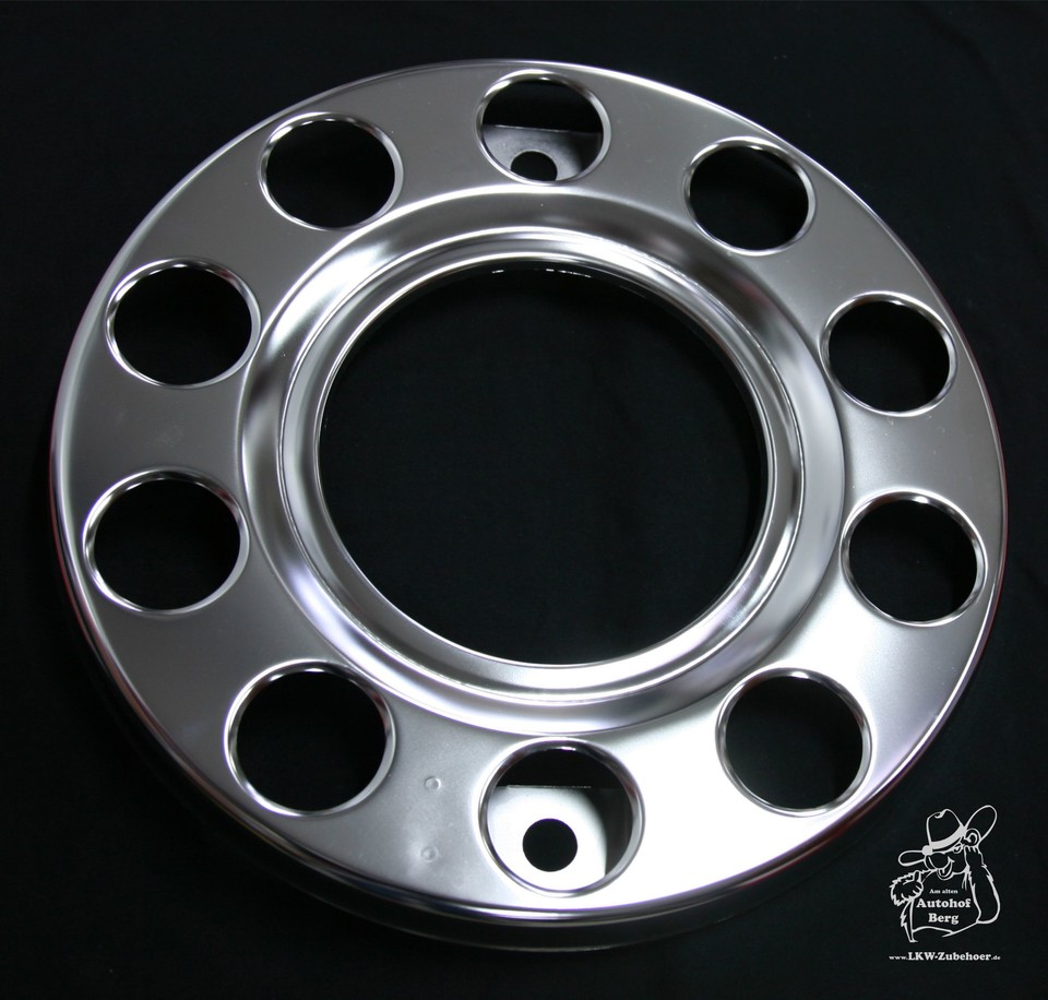 Glänzendes Wheel Cover aus Edelstahl mit runden Aussparungen auf schwarzem Grund.