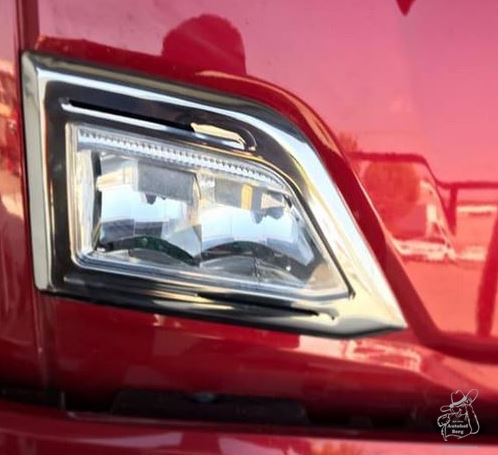Glänzender Edelstahlrahmen für Scania NG Topline LKW-Scheinwerfer auf rotem LKW.