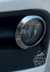 alt: Gepresster Edelstahl-Rahmen für Nebelscheinwerfer, glänzend am LKW montiert.