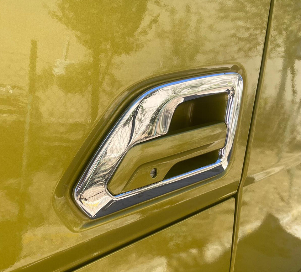Glänzender Edelstahl-Türgriffrahmen auf einer gelb-grünen LKW-Tür.