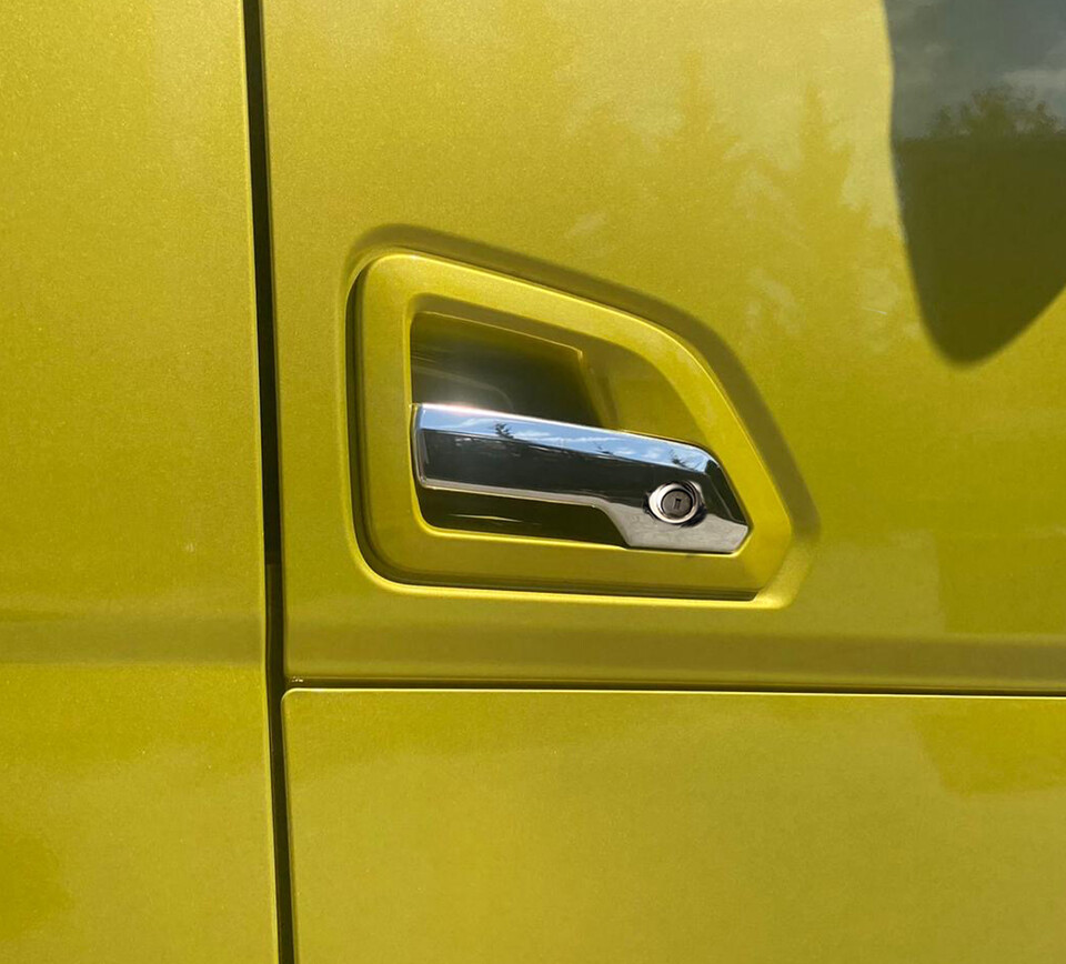 Türgriffhalter rechts an gelber LKW-Tür, mit Chromgriff und Schlüsselöffnung.