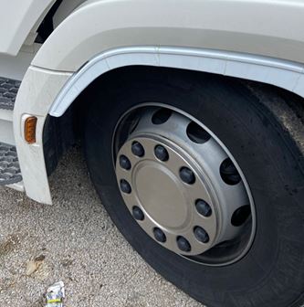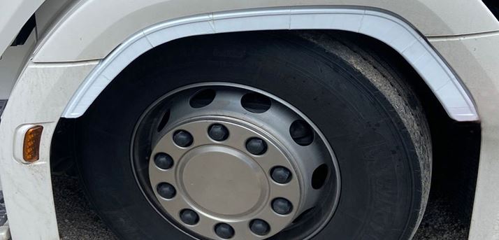 Weiße Felips Kotflügelverkleinerung Spatz aus ABS-Kunststoff über dem Rad eines Scania NG LKW.