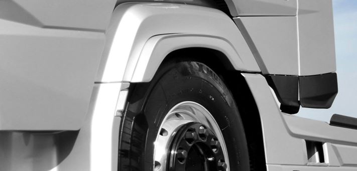 Felips Kotflügelverkleinerung "Spatz" in Silber am Radkasten eines LKW-Reifens.