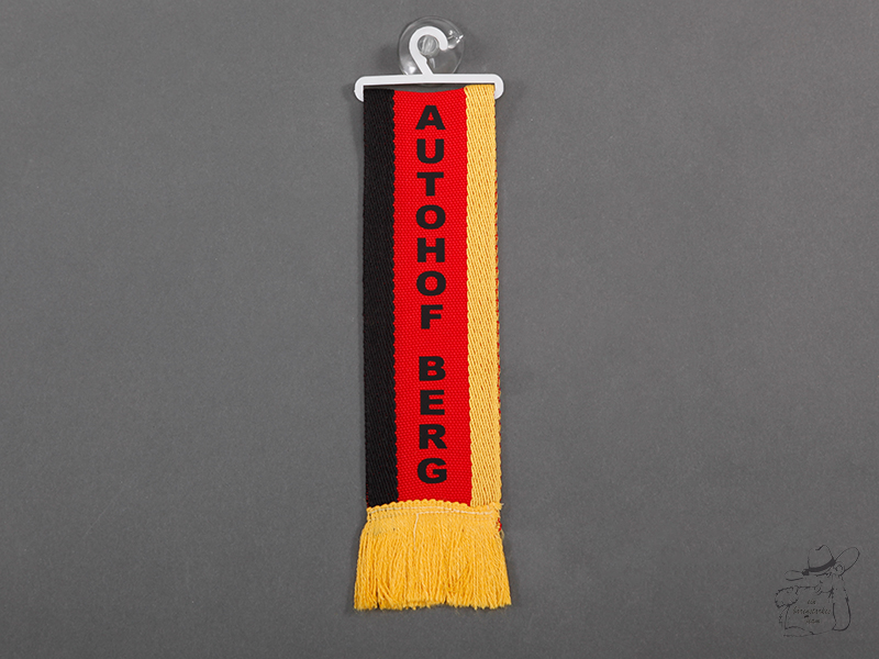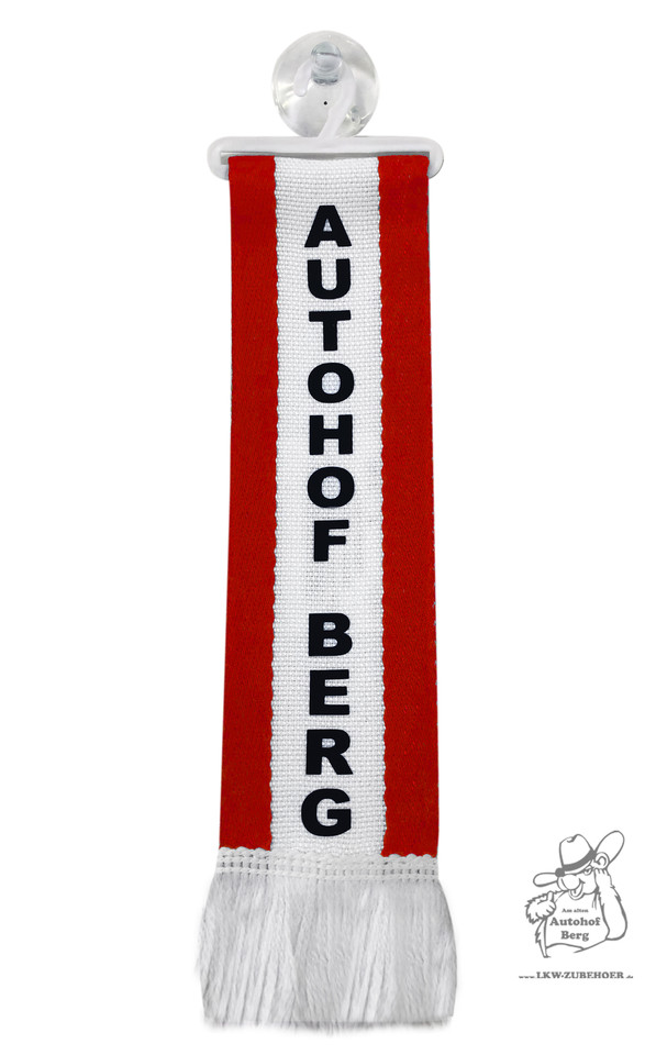 Rot-weißer Minischal mit "AUTOHOF BERG" Schriftzug, inklusive Bügel und Saugnapf zur Befestigung.