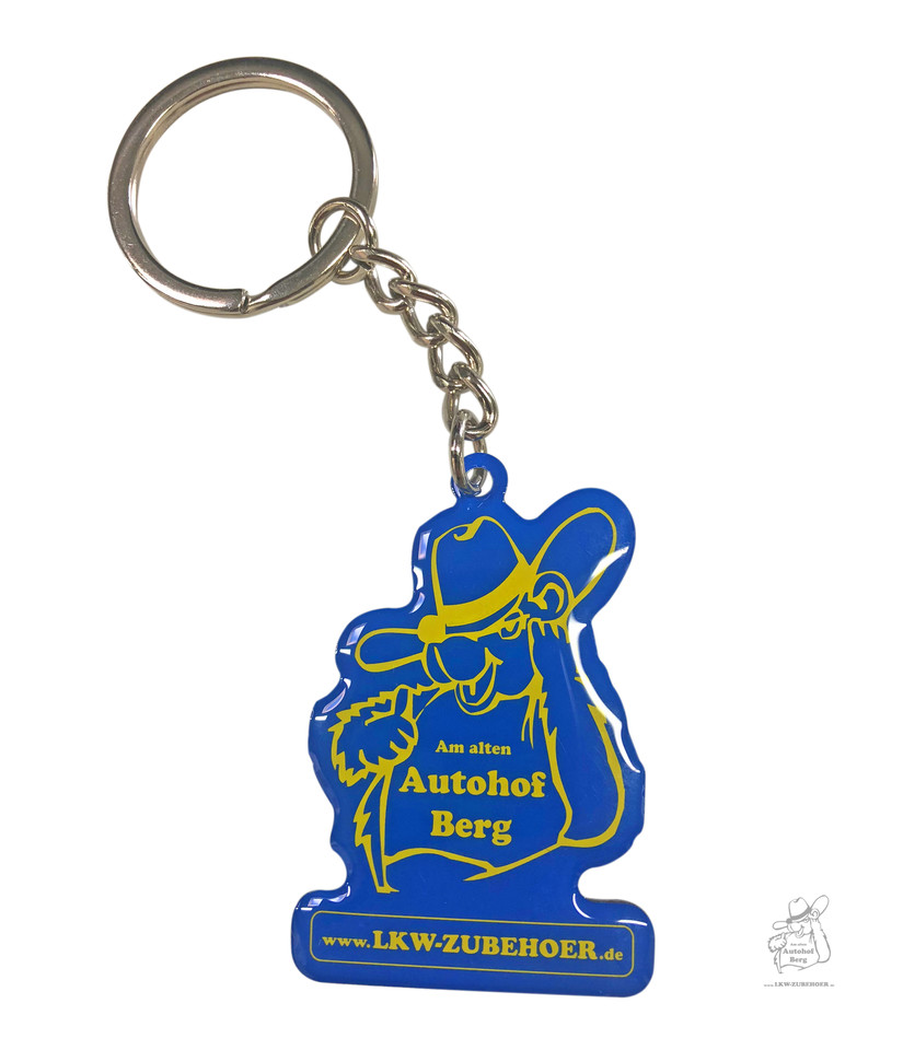 Schlüsselanhänger LKW Zubehör: Blauer Anhänger mit gelbem Trucker-Motiv, Text "Am alten Autohof Berg" und "www.LKW-ZUBEHOER.de".