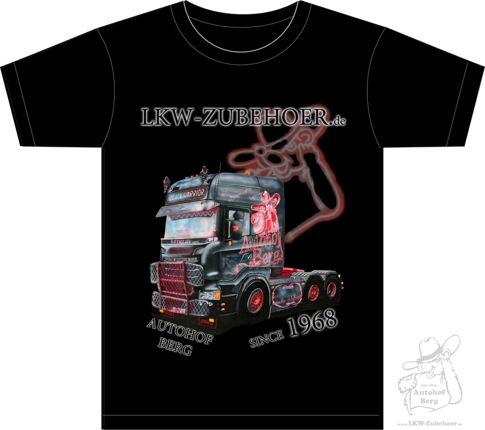 Schwarzes T-Shirt mit LKW-Druck in Schwarz und Rot. Schriftzüge: LKW-ZUBEHOER.de, Black Warrior, Autohof Berg.
