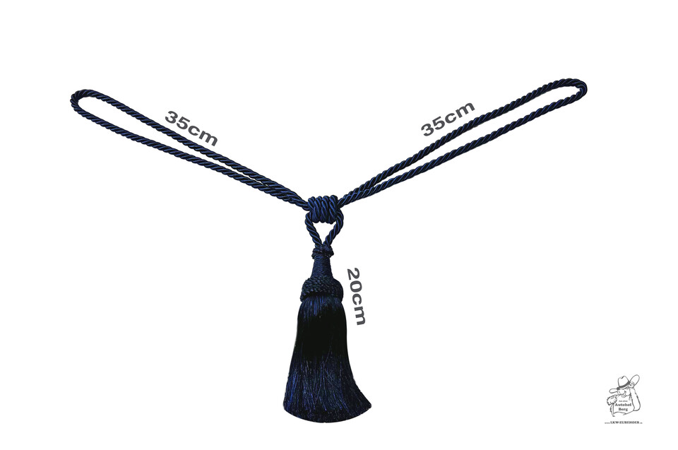 Dunkelblaue Kordel mit Quaste, mittig geknotet und zu zwei Schlaufen geformt.