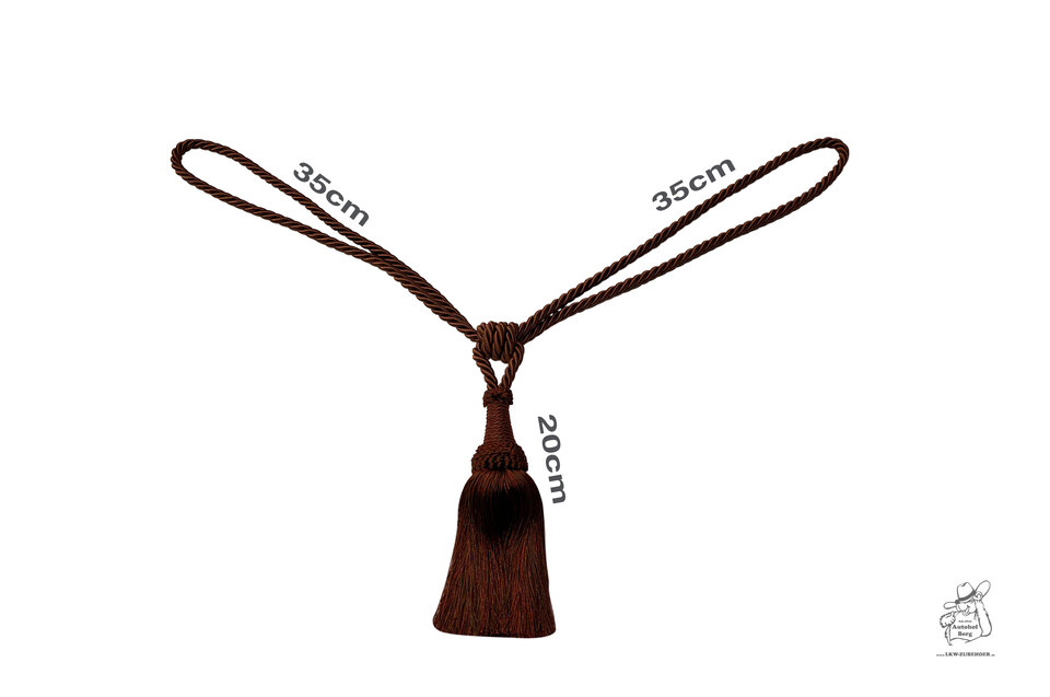 Dunkelbraune Kordel mit Quaste, die von einem zentralen Knoten herabhängt und zwei Schlaufen bildet.