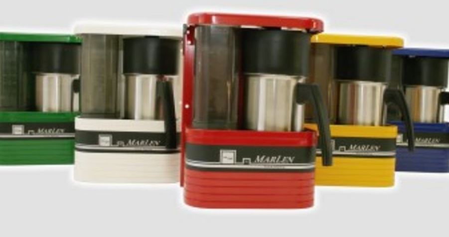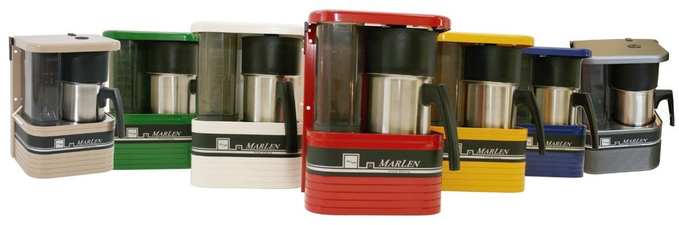 Mehrere Kirk/Marlen Kaffeemaschinen in verschiedenen Farben mit Edelstahlkannen.