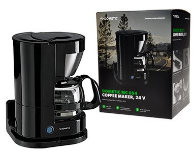 Schwarze Dometic Kaffeemaschine mit Glaskanne und Produktverpackung 'DOMETIC MC 054 COFFEE MAKER, 24 V'.