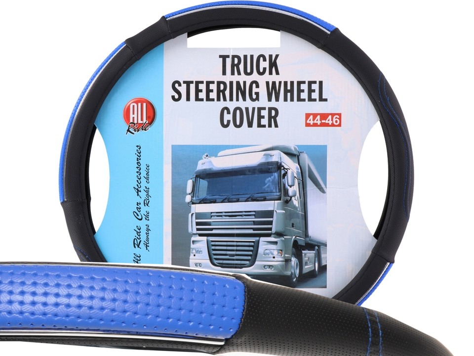 Lenkradschoner für LKW in Schwarz mit blauen Nähten und perforierter Oberfläche. Größe 44-46.