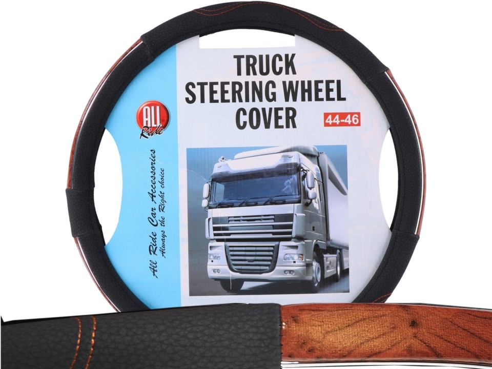 Lenkradschoner in Schwarz mit Holzoptik und orangefarbenen Nähten. Verpackung: TRUCK STEERING WHEEL COVER 44-46.