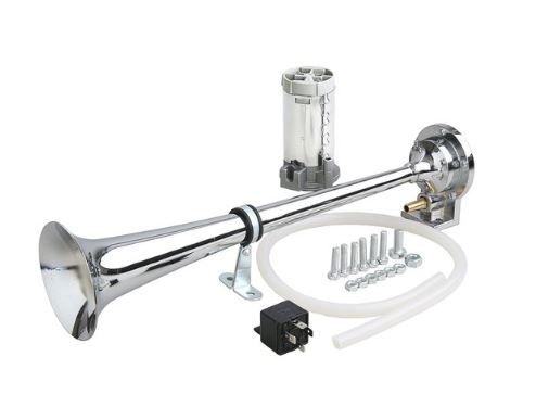 Chrom-Druckluft-Hupe-Komplettset mit Kompressor, Relais, Schlauch und Montagezubehör.