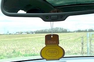 Gelber Poppy Duftbaum "Citrus" hängt am Rückspiegel im Fahrzeug.