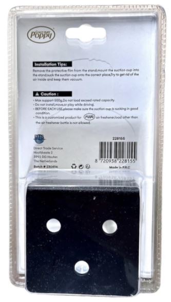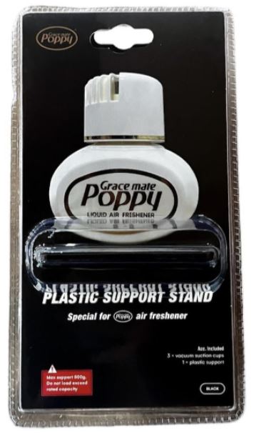 Original Fensterhalter für Poppy Flakon, schwarz, mit Saugnäpfen und rotem Poppy Lufterfrischer.