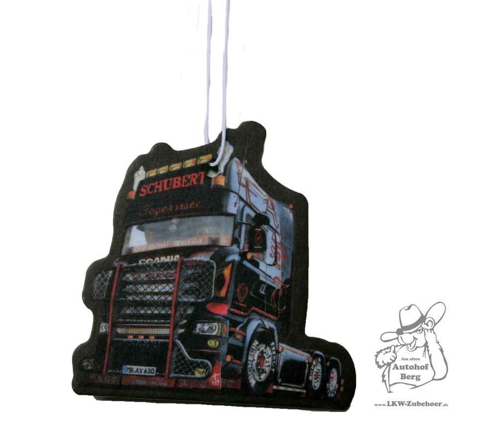 Lufterfrischer in LKW-Form, bedruckt mit einem detaillierten schwarzen Scania-LKW und roten Akzenten, mit weißer Schnur.