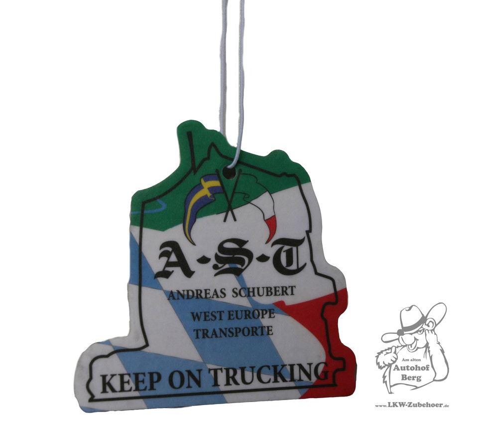 Lufterfrischer AST in Landkartenform mit schwedischer und italienischer Flagge, den Aufschriften "A-S-T" und "KEEP ON TRUCKING".