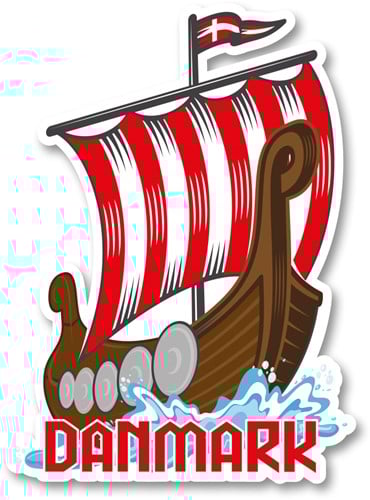 Lufterfrischer in Form eines Wikingerschiffs mit rot-weißem Segel, dänischer Flagge und Wasserspritzern. Text: DANMARK.