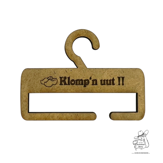 Naturfarbener Minischalbügel aus Holz mit Schriftzug 'Klomp'n uut !!' und Holzschuh-Symbol.